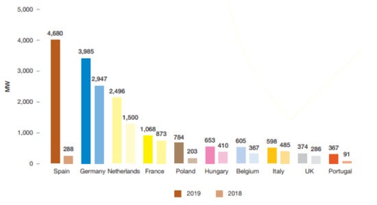To summarise, most of the projection and roadmap studies have simulated scenarios that lead to a shift in the energy system from high fuel and operational costs to a system with higher capital and lower fuel costs. The higher capital costs are due to the investments required to build and renovate the infrastructure to support the high renewable penetration for combined power, heating and cooling needs. The share of electricity in the final energy demand is expected to rise due to the decarbonisation targets of the transport sector using electrical vehicles [23]. The solar PV market witnessed record global growth in 2019 when PV generation increased by 22% [24] despite decelerating growth in China, the world’s largest PV market. The decision to discontinue feed-in-tariffs for focussing on controlling costs and addressing grid integration challenges has temporarily affected the PV expansion in China. Meanwhile, the United States observed stable solar PV growth driven by federal tax incentives and state-level policies. The year 2019 was very good for solar technology in the EU since it witnessed a solar boom with a 104% rise in the installed capacity compared to the previous year. The increase was attributed to the competitive solar energy price, closing deadline for the member states to the binding 2020 emission targets, tender’s/auctions tools, self-consumption, digitalization, storage and corporate power sourcing. Figure 4 illustrates the top 10 EU solar PV markets for the period 2018–2019. Spain observed a significant solar boost due to grid connection deadlines in 2019 for the auctions in 2017 and the introduction of power purchase agreement/wholesale-based solar power plants. Germany witnessed decent growth, thanks to its continuing self-consumption and feed-in-tariff premiums for medium- and large-scale commercial systems. The main driver for Netherland’s growth is the technology-neutral tender programme and its unique net metering scheme [22].