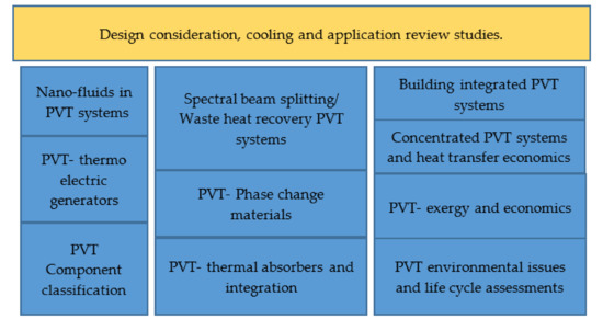 High temperatures lead to a drop in electrical efficiency of photovoltaics (PV) [48], and hence there is substantial research in the field of PV cooling technologies, as seen in the review papers discussed so far. A phase-change material (PCM) is a kind of cooling substance used in the PV and PVT systems, and articles [49,50,51] presented recent advances in the PV and PVT -PCM systems and found that numerical models of the PVT-PCM system and its life cycle analysis (both numerical and experimental) are very limited. In addition, the authors suggested that PCMs relevant for PVT applications must be developed for the enhancement of heat transfer. Thermal absorbers and their fixing methods to PVT are significant for facilitating maximum heat transfer, and Wu et al. [38] presented a detailed review and described that the EVA-based lamination method was found to be the best for integration. Lamnatou et al. [52,53] reviewed a PVT based on environmental challenges and concluded that many studies are based on standard PVT focused on energy payback time and CO2 emissions. Moreover, these are mostly limited to domestic water heating with very few applications in the industry. As a part of future research, it was recommended to focus on life cycle analysis and environmental analysis, including other important environmental indicators, to achieve a holistic picture of PVT and concentrated PVT integrated into buildings in residences and industrial settings. Several review studies have acknowledged the impact of climatic conditions on the PVT collector performance, which is critically reviewed by Elbreki et al. [54], where the authors summarised the influence of each parameter on the electrical, thermal and overall efficiency of the PVT system based on the available results from the literature. Debbarma et al. [55] reviewed building-integrated PV and PVT studies and reported that PVT is preferable to PV, and indicated that it is essential to utilize its thermal energy to avail the economic benefit. Figure 5 summarises the key areas discussed in reviews so far.