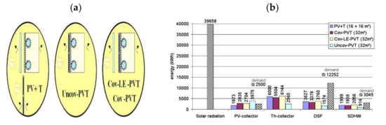 A direct solar-roof-based hybrid PVT system was studied numerically using TRNSYS by Fraisse et al. [76]. In this research, the following four configurations, as shown in Figure 9a, were studied: PV and solar thermal collector separately, unglazed PVT, glazed PVT and low emissivity (LE) () glazed PVT. The annual energy performance can be seen in Figure 9b, where the glazed LE PVT had better performance than other configurations. In addition, the glazed LE PVT system emitted less CO2 emissions both from heating and electricity. However, it was observed that the unglazed PVT performed 1.47 times and 2.1 times better in terms of electricity production when compared to the glazed LE PVT and the conventional PV + T separated configuration.