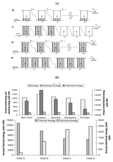 Theoretical modelling of partially covered flat plat collectors was done by Dubey et al. [77] where four different configurations (Figure 10a) in five different cities were considered. The cities had different climatic conditions with differences in sunshine hours and global to diffuse solar radiation ratio. The results of exergy, thermal and electrical energy were shown in Figure 10b. The authors confirmed that a fully covered collector is beneficial if the primary requirement is electrical energy, and in the case of a thermal energy yield, a partially covered collector had better performance.