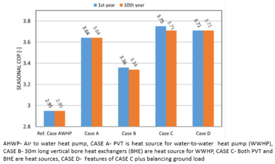 Seasonal coefficient of performance of different system configurations (reprinted from [84], with permission from publisher and information is added).