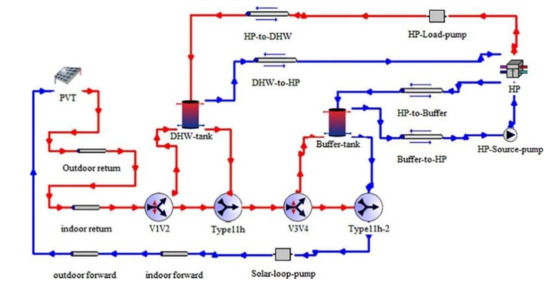 An active opaque PVT façade system using refrigerant as fluid can produce electricity and thermal energy and acts as a barrier to reduce heat gain by 40% and heat the cavity air for preheating the building’s fresh air [79]. The system’s electrical efficiency was 9%, and the COP reached up to 3.1 while providing hot water up to 40 °C. The energy performance of four system configurations shown in Figure 11 for space heating and domestic hot water in a single-family house is compared in [80] using results from TRNSYS and reported that the simpler configuration involving PVT and heat pump is a good solution for heating-dominated buildings. Yao et al. [81] have proposed a hybrid residential heating system using a direct expansion solar PVT assisted heat pump with a borehole heat exchanger (BHE). The authors compared the performance of the hybrid system with a single BHE and reported that the former had better thermal energy performance. The parametric analysis confirmed that mass flow rate and inlet temperature played a key role in heat extraction from BHE. The maximum outlet temperature of the water was 40.8 °C at a solar fraction of 67.5% and irradiation of 600 Wm−2. Dannemand et al. [82] studied the performance of PVT coupled with a heat pump and two storage tanks by conducting transient analysis in TRNSYS, as shown in Figure 12. The setup was expected to be low cost compared to the liquid–liquid heat pump systems with a ground source heat exchanger. The system’s performance was assessed based on the International Energy Agency solar heating and cooling programme [83] key performance indicators, which include solar thermal fraction, solar electrical fraction, net renewable energy fraction and inverse system seasonal performance factor. The idea is a buffer storage tank that can be charged using an unglazed PVT collector to the temperature levels of the ambient air even without sufficient solar irradiation. However, it was reported that the system was not economical for the loads considered in the study and recommended testing it for multifamily buildings.