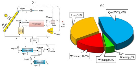 Zarei et al. [92] worked on increasing the performance of a solar CCHP for residential consumption by using a hybrid ejector-VCR refrigeration cycle driven by the PVT (Figure 13a) and used environmentally friendly refrigerants such as R290 and R600a. The authors specifically studied the effect of panel cooling on the performance of the ejector-VCR refrigeration cycle while using the coolant water from the outlet into the condenser. R290 has shown the better performance of the refrigeration cycle by 7.5% compared to R134a. Cooling the PV panels enhanced the COP by 5.25%, increased the outlet water temperature by 9.16 °C and reduced the refrigerant mass flow rate by 25.24%. It was reported that the mass flow rate affects the outlet water temperature and then the overall efficiency of the PVT system. Figure 13b illustrates the energy distribution incident on the PVT.
