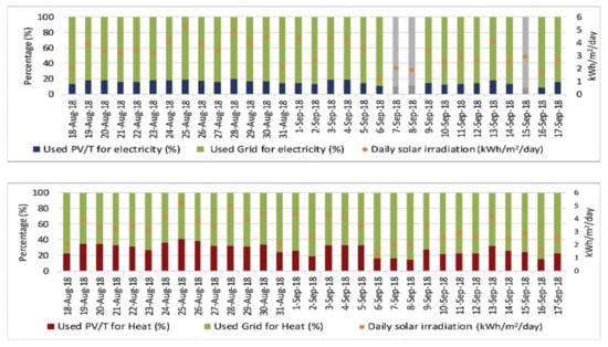Percentage of PVT contribution to supply the electrical and heat demands for 31 days (reprinted from [93], with permission from publisher).