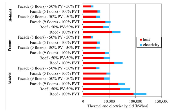 Pokorny et al. [94] conducted an experimental and analytical investigation of a new concept of glazed PVT collector (encapsulation was done using polysiloxane gel) for a multifamily building with 45 flats and 100 occupants in three locations. Two different configurations were tested involving rooftop installation and façade integration, and the simulation study results are shown in Figure 15. It was reported that the specific thermal and electrical yield of façade PVT installation was lower compared to the rooftop PVT.
