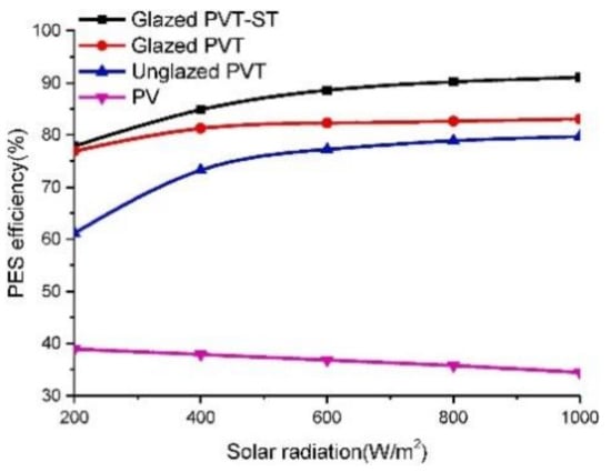 Jeong et al. [85] have conducted a feasibility study of combined heating, cooling and domestic water system coupled to PVT and ground source heat pump using TRNSYS. The authors reported that the seasonal performance factor of the hybrid system increased by 55.3% compared to the conventional GSHP for a building in Seoul, Korea. It was observed that the SPF is dependent on the set supply temperature and the use case of produced solar heat. Yao et al. [86] studied a direct expansion PVT heat pump coupled with phase-change material (PCM) to overcome the intermittency of solar energy due to weather changes. The coefficient of performance for heating was 6.6, a significant 94% higher than the conventional air conditioning system. The overall efficiency was 73.87%, and the temperature of underfloor heating with build-in PCM heat storage reached 22–31 °C. Possible refrigerant leaks characterize the direct expansion PVT heat pump systems due to their design features. Hence, the indirect expansion PVT heat pump systems, where a fluid is used to absorb the solar thermal energy and transfer it to the heat pump cycle, can be a simple solution. So, Obalanlege et al. [87] investigated a solar combined heat and power system by conducting short-term analysis to understand the ability of the system to respond to intermittency by understanding transient effects and contribute to the development of control systems for running the energy system with optimized parameters. The coefficient of performance of the heat pump was not affected by the increase in solar irradiation, while overall systems’ COP increased by 1.2. The system’s thermal and electrical efficiencies were increased with larger tank size and higher flow rate, while panel temperature is decreased. The enhancement of thermal efficiency was significant compared to electrical efficiency. Chen et al. [88] experimentally studied a PVT and dual-source heat pump water heating system. An air-cooled evaporator mode was selected when there was inadequate solar energy, while a water-cooled mode was adopted when there was sufficient solar irradiation. It was reported that the electrical efficiency could be increased up to 13.44% in a water-cooled way.
