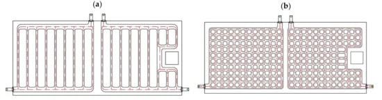 The influence of channel configuration on the performance of PVT collector was studied by Yu et al. [101] by considering two different roll bond absorber plates as shown in Figure 17a,b. The grid-channel PVT (PVT-2) had better electrical and thermal efficiency than the harp-channel PVT (PVT-1). PVT-1 had less pressure drop and thermal inertia in the pipes and was able to work under natural circulation or with less electricity. The harp-channel plate was evaluated using the conventional F’ efficiency factor used in the sheet and tube absorber, while the grid-channel plate required a performance test. PVT-2 was recommended in the case of forced circulation. The performance of a copper-sheet-laminated PVT using copper oxide/water and nanofluid was studied by Michael et al. [102] and reported that the nanofluid-based system significantly improved the thermal efficiency compared to water-based PVT. However, the electrical efficiency saw a reduction due to the higher temperature of the PVT collector obtained because of the higher thermal conductivity of nanofluid and fixed effectiveness of the heat exchanger. It was suggested that the electrical efficiency could be improved with a better design of heat exchanger with high effectiveness accounting for nanofluid volume concentration. Lari et al. [103] have conducted a techno-economic performance analysis of a hybrid parallel-serpentine heat exchanger-based PVT system. The authors compared an uncooled PV system with a water-cooled and nanofluid PV system for the climate of Dhahran, Saudi Arabia, and reported an increase of 8.5% and 13% electrical output, respectively. This proposed PVT system was modified by retrofitting a PCM thermal battery [104], and the performance was compared with the system without PCM retrofit. The low operating temperatures of PVT adversely affected the discharging of PCM battery and reduced electrical and thermal efficiencies by 2.2% and 7.7%, respectively, compared to the system in [103]. Haurant et al. [105] evaluated a 3D dynamic numerical model of a custom-made bionic channel heat exchanger-based PVT. The dynamic model was based on energy conservation and was well-adapted to the fractal geometry of the heat exchanger and can be used as a function in simulation tools like TRNSYS.