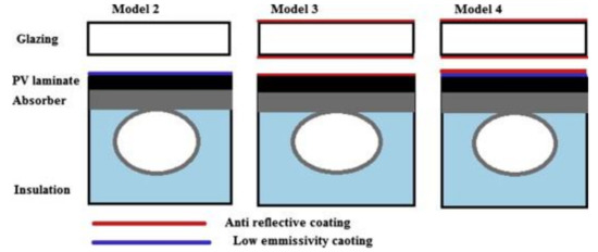 The effects of meteorological conditions, design and optical parameters on electrical and thermal efficiencies were studied by Rejeb et al. [108] by evaluating different PVT collector designs, traditional solar thermal collector and photovoltaic module. The influence of wind speed on the performance parameters was observed where the electrical efficiency was improved at higher wind speeds due to better cooling of PV cells, and simultaneously, thermal efficiency was reduced due to high heat convection to ambient. Figure 18 shows different PVT configurations studied in the paper.