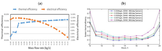 (a) Thermal and electrical efficiency of the system for different mass flow rates (reprinted from [110], with permission from publisher); (b) thermal efficiency profile for various mass-flow rate and hot water profile (reprinted from [111], with permission from publisher).