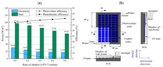 (a) Change in electrical and thermal efficiency as a function of shadow ratio; (b) frame shadow on PV/T collector surface (reprinted from [114], with permission from publisher).