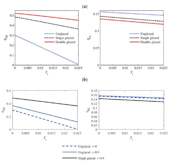 (a) Thermal and electrical efficiency of PVT for different covering on the top, (b) thermal and electrical efficiency of PVT for different cell emissivity values and covering on the top (reprinted from [115], with permission from publisher).