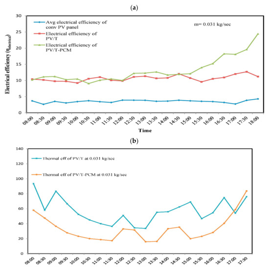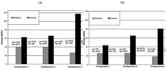 (a) Electrical efficiency at 0.031 kg/s; (b) thermal efficiency at 0.031 kg/s (reprinted from [116], with permission from publisher).