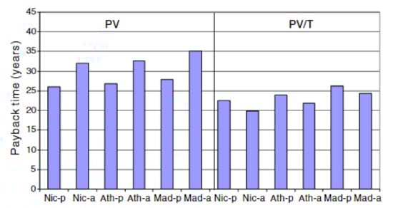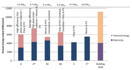 He et al. [117] conducted an experimental study comparing PV, PVT and thermal collector under the natural circulation of water using a thermosiphon system. The results indicated that the thermal collector’s thermal efficiency was superior to PVT (40%) and the electrical efficiency of the PV plate was better than PVT (10%). However, the primary energy saving efficiency of PVT (60–75%) was much better than that of the conventional thermal collector and the individual PV system. Primary energy saving efficiency concerns both the quality and quantity of energy, and it is evaluated as the sum of thermal efficiency and electrical efficiency of PVT (normalised to electric power generation efficiency (~38%) of the conventional power plant). Good et al. [118] conducted a comparative study for three buildings (six variations shown in Figure 24), intending to achieve a net-zero energy balance. The authors concluded that the building with high-efficiency PV panels is the closest to a net-zero energy building, followed by a building with average quality solar thermal collectors and high-efficiency PV. The study also supported the idea that PV and heat pump combination is more efficient than solar thermal collectors for residential buildings. The PVT options could not reach high operating temperatures even during summer, and there is a necessity of auxiliary heating, making the PVT system suitable for preheating applications only.