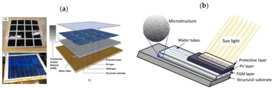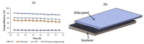(a) Schematic of the system; (b) distribution of energy incident on PVT from the Sun at irradiation = 945 Wm−2 and water mass flow rate = 0.013 kg/s (reprinted from [92], with permission from publisher).