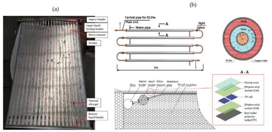 - Diallo, T.M.; Yu, M.; Zhou, J.; Zhao, X.; Shittu, S.; Li, G.; Ji, J.; Hardy, D. Energy performance analysis of a novel solar PVT loop heat pipe employing a microchannel heat pipe evaporator and a PCM triple heat exchanger. Energy 2019, 167, 866–888. [Google Scholar] [CrossRef]