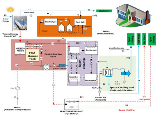 - Zafar, S.; Dincer, I. Thermodynamic analysis of a combined PV/T–fuel cell system for power, heat, fresh water and hydrogen production. Int. J. Hydrog. Energy 2014, 39, 9962–9972. [Google Scholar] [CrossRef]