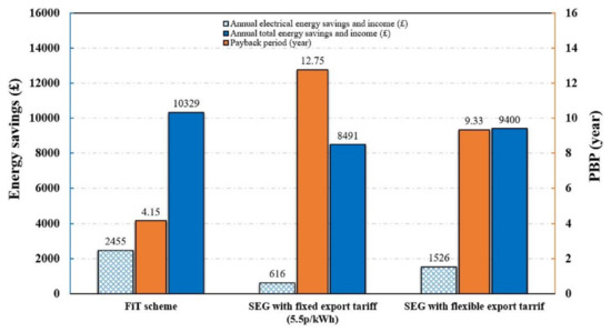 Integrating the heat pump into the PVT system is a widely employed design concept to increase the overall energy efficiency. However, the refrigerants used in the system are not eco-friendly and may lead to environmental damage, thus potentially reducing the ecological benefits of a solar energy system. The inclusion of a battery or a heat pump increases the cost of the solar energy system [89], and sometimes using excess battery energy can impact [90] the sizing of the actual PVT system. Thus, Behzadi et al. [91] proposed a novel PVT system (excluding battery and pump) with a thermal storage unit with the potential to zero energy bills for buildings via two-way trade of low-temperature heat and electricity by the local grids. The modelling of the system is done using Matlab-TRNSYS and was employed for a real case study house located in Denmark. The proposed system’s yearly utilisation factor was calculated as 61% and could easily match the building’s hot water demand. The system was feasible without auxiliary systems due to selling excess energy to the local grids.