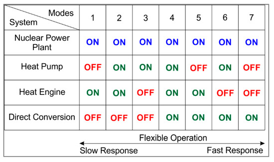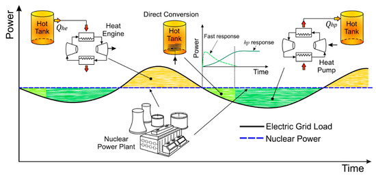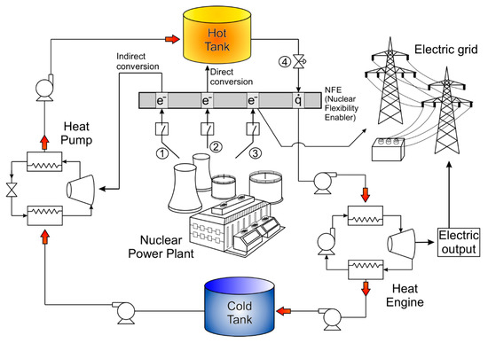 The three fundamental operational modes are (1) nuclear to heat pump to thermal storage; (2) nuclear to storage (direct conversion), and (3) storage to heat engine to grid. Ternary refers to the three modes operation: (i) heat pump (including heating coil), (ii) heat engine, and (iii) simultaneous operation of the heat pump (including the heating coil) and the heat engine during changeover from pumping to generation or vice-versa. Other important operational modes include the simultaneous operation of two or more integrated subsystems as can be appreciated in Figure 2. In all cases, the nuclear power plant operates at nominal power and the power flexibility is handled by the integrated subsystem managed by the NFE. Different operational modes can satisfy a variety of load requirements at different response times, from a daily load demand increase/decrease, changes in supply due to the grid-connected renewable based power generation, to fast response in power supply/curtailment due to a failure of an external grid-connected system.