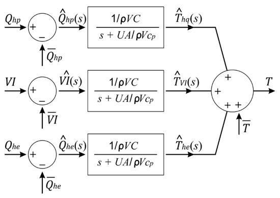 In this work, is assumed to be approximately the temperature of the hot tank, i.e., . The initial temperature in the tank is and the maximum possible temperature in the tank is set to 700 K. The corresponding initial and maximum energy in the tank can be determined as and , respectively. The transfer function based on the energy balance of (5) is presented in Figure 5. A state-space model of the hot tank is shown in Appendix A.
