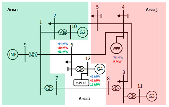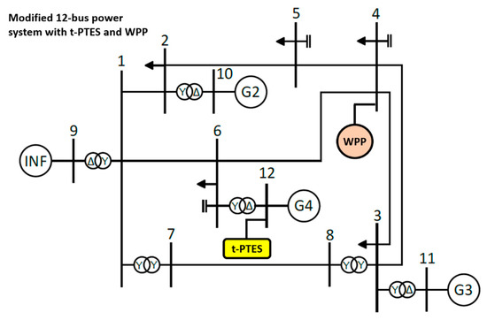 The electric grid is modeled in a Digital Real Time Simulation (DRTS) platform. The model consists of bulk generation and loads at transmission level. The simulations are performed on a modified 12-bus system, see Figure 6, consisting of three synchronous generators with thermal plant governors and five load buses [15]. A slack bus generator representing a strong grid (ideal source) is present at bus-9. For our analysis, the grid model is modified by integration of 40 DFIG-based wind turbines of 2.3 MW each at bus-4, and the generator at bus-12 is chosen as the representative 500 MW nuclear power plant (NPP) with a standard TGOV5 governor for simulations and integration of the t-PTES system [16,17].