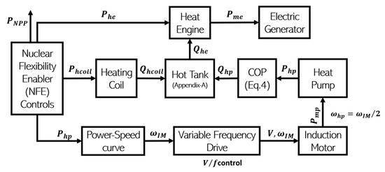 The integrated system with NFE controls and t-PTES subsystems are shown in Figure 7 below. The three main subsystems of the t-TPES are: (i) heating coil, (ii) heat pump, and (iii) heat engine. The heating coil is modeled as a resistive load with 98.5% efficiency [18]. The heat pump is modeled using a variable frequency drive (VFD), and V/f control is used for simple speed control of the induction motor [19,20,21,22,23]. A feedforward control is adopted using the characterized curve for the power-speed curve for the VFD-based heat pump. The thermal model of the compressor, absorption chiller, and evaporator is modeled using a transfer function and equation-based modeling is used for the temperature-dependent coefficient of performance (COP) to obtain heat energy input to the hot tank.