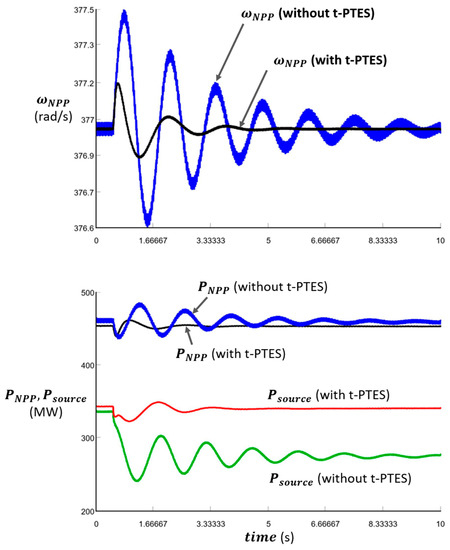 Time-domain response of the NPP generator and source for the 60 MW step load drop at bus-6. It can be noted that frequency (top plots, rad/s) and power (bottom plots, MW) oscillations for both the NPP generator and source (ideal source representing bulk grid interconnection to the 12-bus 3 area power system) are reduced with the use of the heating coil (approx. 60 MW) which provides a sub-second response. (x-axis: time in seconds). In the top plots, the blue curve is NPP (G4) frequency (without t-PTES), and the black curve is NPP (G4) frequency (with t-PTES). In the bottom plots, blue and red curves: NPP (G4) power and source power (without t-PTES), and black and red curves: NPP (G4) power and source power (with t-PTES).
