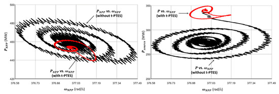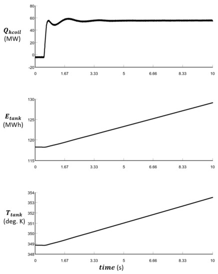 This case shows that NPPs may be subjected to varying output when subject to high variability of renewables such as wind and solar. The study presents a case of inter-area power flow variation due to power output reduction from a WPP from 78 MW to about 9 MW in approximately 10 s. The focus of the simulations is on Area-2 where the NPP is located and due to change in WPP output; the tie-line (buses 1–6) power flow also varies between Area-1 and Area-2. The line flow values are shown for pre-event, post-event, and after using the t-PTES to regulate tie-line flow [17]. This operation avoids the use of the NPP to perform unscheduled up-regulation and can be managed by reducing the heating coil load in service. Alternatively, reduction in heat pump or increase in heat engine output can also be used to support regulation. We show simulation results using the in-service heating coil as part of the t-PTES as shown in Figure 11, Figure 12 and Figure 13 below.