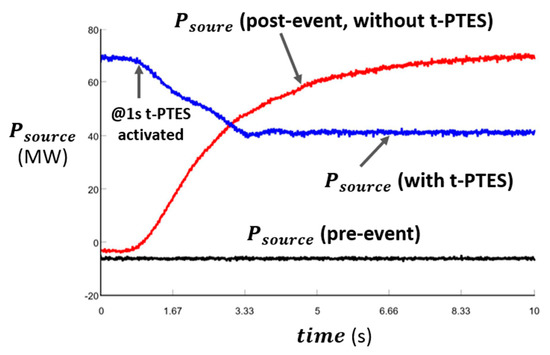 Inter-area power flow (-ve sign is direction of power flow from bus1 into the bus6) under pre-event, post-event, and post-event recovery using t-PTES is shown. The black curve shows pre-event source output, the red curve shows pre-event tie-line flow (without t-PTES activated), and the blue curve shows post-event source output (with t-PTES activated post-event).