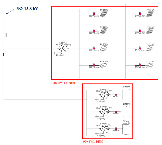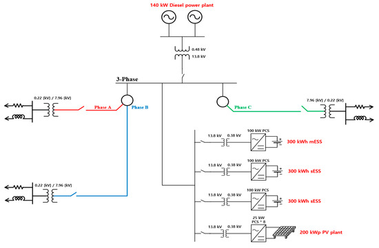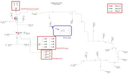 Figure 7 shows the PSCAD/EMTDC simulation modeling of the entirety of Floreana Island. A 140 kW diesel power plant, 200 kW PV plant and 900 kWh ESS were designed. In addition, it was designed in detail considering the actual line length and power load. As mentioned above, the phase C load is the largest, composed of about 46% of the total load. In Figure 7, it can be seen that the phase C load is the largest even in the three phase indications. Additionally, in this study, the diesel generator was not reflected in the computer analysis result because BESS operates to provide voltage and frequency to the system.