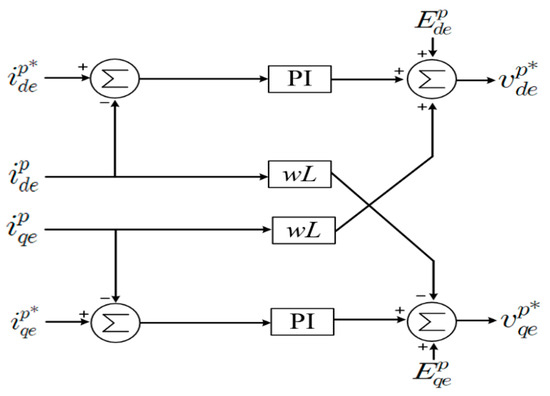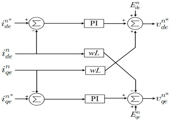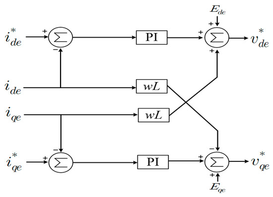 Figure 3 is a block diagram of a current controller applied to a general sBESS. After calculating the dq-axis terminal voltage of the two-level inverter through Park’s conversion, and applying the PI controller considering the overshoot and rise time, it can be expressed as Equations (1) and (2) [25,26]. In this equation, the dq command current was set as in Equations (3) and (4). and is controlled so that the active power of the mBESS is output as 0 MW and the reactive power is always 0 MVar within the range of the upper and lower limits of the sBESS SoC.