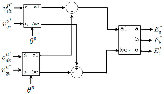 The PSV, NSV, PSC and NSC calculated in the sBESS are independently controlled as shown in Figure 4 and Figure 5. In the same way as general inverter control current equations, the PSC and NSC equations can also be expressed as Equations (7)–(10). In Equations (7) and (8), the command values are defined and controlled as shown in Equations (11) and (12). Active and reactive power can be controlled as mentioned in Equations (3) and (4). In general negative sequence control, are controlled to 0. However, in the proposed method, the current controller of the command value is expressed by Equations (13) and (14). In this equation, integral control is performed so that follows 0. Through this, sBESS compensates for the NSC of the mBESS. This means that sBESS supplies NSC instead of the mBESS. z in Equations (11)–(14) means the number of inverters of the sBESS, and each inverter can control the power of the mBESS equally. By applying the proposed method, the mBESS supplies a balanced three-phase current. From this operation, one-phase overload does not occur, the PCS can prevent the overcurrent tripping of IGBT. The PSV and NSV command values derived through the DCC are summed in the stationary reference frame as shown in Figure 6. The combined value is converted to three-phase abc voltage and output as the command value of each phase.