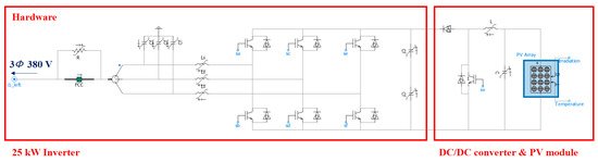 Figure 8 is an enlarged view of the PV power plant and the BESS side in Figure 7. It consists of a BESS connected with three 100 kW PCS units and a PV plant connected with eight 25 kW PCS units. One of the three BESSs performs CVCF control providing voltage and frequency to the grid. The other two are sBESS supporting mBESS, and in order to verify the proposed control, it is designed as shown in Figure 9 by reflecting Figure 4 and Figure 5 in the simulation modeling. BESS’s battery model used the library provided by PSCAD/EMTDC is indicated by the orange box. Figure 10 is a simulation model of a 25 kW PV. The PV module in the blue box is a library provided by PSCAD/ETMDC, and the input parameters, which are solar radiation and temperature data, were set as data actually measured in the Floreana Island. The DC/DC converter linked to the PV module performs MPPT control [27,28,29,30]. Additionally, the 25 kW inverter performs DC link voltage control to stably supply PV power to the grid [31,32].