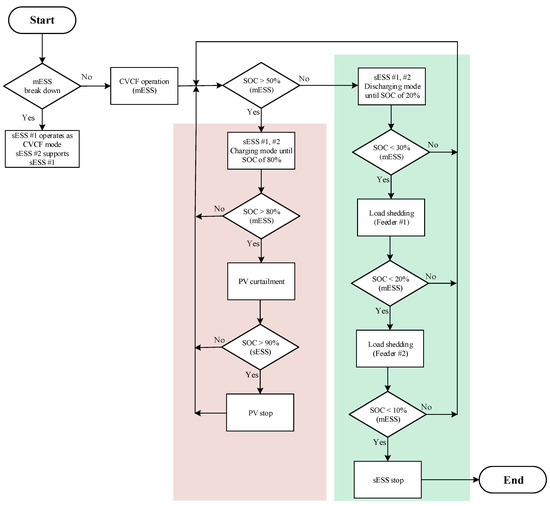 The Floreana Island microgrid can be managed with the EMS logic shown in Figure 11. First of all, if the operation is stopped due to a malfunction or inspection of the mBESS, the sBESS should operate the system instead of the mBESS. If mBESS provides voltage and frequency to the grid, the logic varies according to the SoC of the mBESS. First, as shown in the red box, the PV generation amount must be limited so as not to exceed the SoC upper limit of the mBESS. If the SoC is over 80%, the PV output must be limited. For example, it means stopping PV inverters for the amount of excess generation among all PV inverters. Additionally, if the SoC is more than 90%, all PV generation must be stopped to ensure the stability of the mBESS. Second, a green boxlike logic is required so that the SoC of the mBESS does not fall below the lower limit. If there is no solar power generation and the SoC of the sBESS is lower than 20%, the mBESS alone may supply power to the load without assistance from other distributed power sources. Accordingly, the mBESS alone supplies the unbalanced current, and the inverter may stop operating due to an overload of one phase. In consideration of such a situation, in this paper, the proposed control is applied to the sBESS so that the mBESS can be balanced without causing a single phase overload.