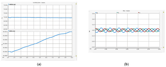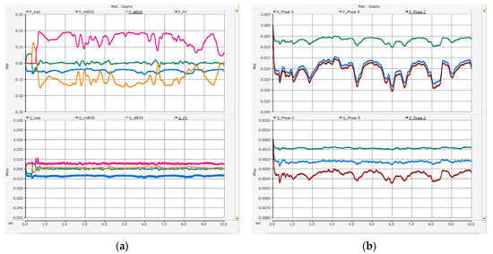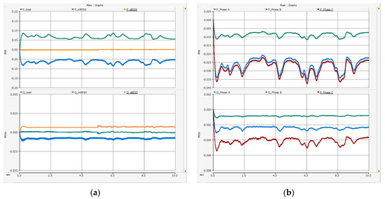 Figure 12a is the result of active and reactive power when all systems are operated. The PV output fluctuates as the actual insolation and temperature data are reflected. Since sBESS is controlled so that the active and reactive power of the mBESS is 0 MW, 0 MVar, it charges and discharges in response to PV output fluctuations instead of the mBESS. The load demand result of each phase of Floreana Island is shown in Figure 12b. Phase C of brown expression was the largest, with a maximum of about 37 kW, phase A (blue color) was 35 kW and phase B (green color) was about 12 kW. In addition, phase C consists of a transmission line that is longer than the other phases, as shown in the overall simulation model in Figure 7. Accordingly, there is a large difference in the value of reactive power.