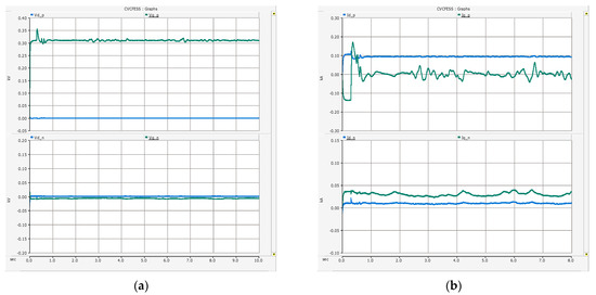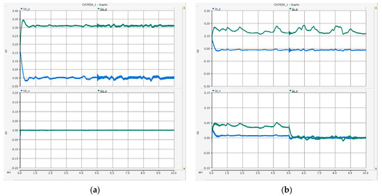 Simulation results of Scenario 1 (a) mBESS (top: dq-axis PSV; bottom: dq-axis NSV) and (b) mBESS (top: dq-axis PSC; bottom: dq-axis NSC).