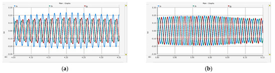 Simulation results of Scenario 2 (a) instantaneous three-phase current of the mBESS before dual current control (DCC) and (b) instantaneous three-phase current of the mBESS after DCC.