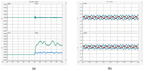 Figure 13b shows the result of the three-phase instantaneous current of the mBESS in about 6 s when the load demand is at its highest. The three-phase current is not balanced due to the unbalanced load. At this time, the maximum current of one phase is about 0.05 kA. Since the sBESS controls the output of the mBESS to 0, the overcurrent tripping of the mBESS does not occur. Figure 14 shows the PSV, NSV, PSC and PSV dq results of the mBESS. Due to the CVCF control, the three-phase voltage maintains a balance, and in the result shown in Figure 14a, the PSV on the q-axis is about 311 V, which is the maximum of the phase voltage, and the NSV is 0 V. Additionally, the change of the PSC is the same as the change of the mBESS active power in Figure 12a. Additionally, since unbalanced current control is not performed in Scenario 1, the mBESS supplies NSC as shown in Figure 14b.