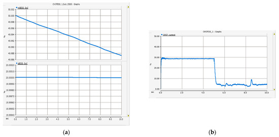 In Figure 17a, the PSV and NSV results of the dq-axis are the same as in Scenario 1, the PSV on the q-axis is 311 V, which is the maximum value of the phase voltage, and the NSV is 0 V. In the result of Figure 17b, the PSC occurs as much as power is supplied to the load, and the NSC of the dq-axis converges to 0 A as DCC is performed in 5 s. Figure 18a is the result of PSC and NSC of one sBESS. Since only the negative sequence is controlled, the value of the PSC is maintained at 0 A, and the control starts in 5 s, and two sBESSs supply the NSC. Additionally, it can be seen from Figure 18b that two sBESSs share and supply the reverse phase current of the mBESS equally. In addition, since sBESS supplies only NSC, it hardly discharges, as shown in the SoC result of Figure 18a. This means that even if mBESS is operated alone, it will be able to stably operate the power system by supporting mBESS regardless of the SoC of the sBESS. In Figure 19b, after 5 s, the current unbalance rate of the mBESS became 4% and decreased by about 26% compared to before control.
