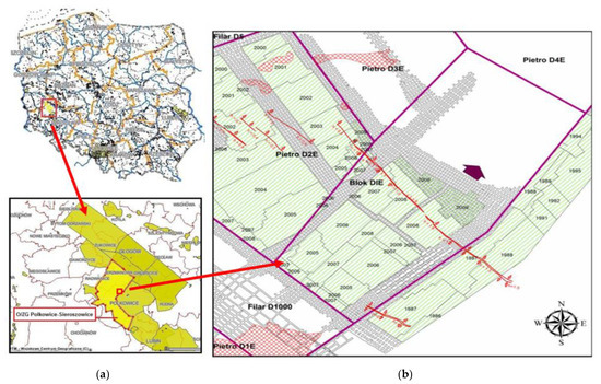 The research area in this case study is one of the mining fields located in the Polkowice-Sieroszowice mine (Figure 1). The copper ore deposit is 2.0–2.8 m high, extends in the NW-SE direction, and dips (2–3°) toward NE. The depth of the deposit is approximately 1000 m. It includes mostly sandstone (gray, quartz, and fine-grained sandstone), cupriferous shale (clay and dolomite-clay), as well as dolomite (streaky, dark gray, cryptocrystalline). The roof is built of rock layers being part of the Zechstein carbonaceous series, and the floor is made of grey Rotliegend sandstone. The tectonics in the field is quite poor. One fault is located in the middle part of the mining filed and has an approximately 0.5–1.5 m throw [11].