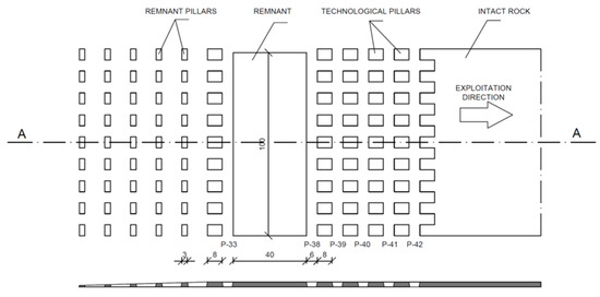 Exploitation in the analyzed field was carried out in constrained mining conditions. In 2007, because of problems ensuring the roof’s stability in the central part and in the right side of the field, a deposit remnant approximately 40 × 100 m was created, between strip P-38 and strip P-33 (Figure 2) [13].