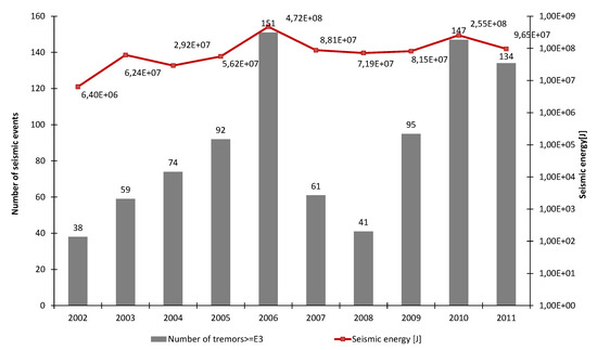 The analyzed mining field was characterized by a relatively high level of seismicity. Figure 3 presents yearly distribution of the number of mining tremors as well as seismic energy emissions for the period of 2002–2011. The greatest number of seismic events and the highest level of seismic energy emission were recorded in the field in 2006. In December 2006, a very high-energy, class E8 seismic event occurred. It seriously influenced the roof stability in the central part and in the right side of the field. The mining front was being reconstructed with strips P-34 ÷ P-37, but in August 2007 increasing problems with the roof necessitated stopping them, and the progress of the P-38 ÷ P-42 strips began. As a result, a remnant approximately 40 m in width was formed. While restoring the front in the right side of the field, on 13 March 2007, a seismic event having an energy of 107 J was recorded. Then, on 4 October 2007, the second event with an energy of 4.4 × 107 J occurred. The epicenters of these events were located in the vicinity of the remnant, while the epicenter of the tremor from October 2007, on the edge of the undisturbed rock remnant. The geophysical mechanism of this event shows rock mass displacement on the reverse fault in the SW direction (towards the gob areas). This surface runs in the direction approximately consistent with the mining front line.