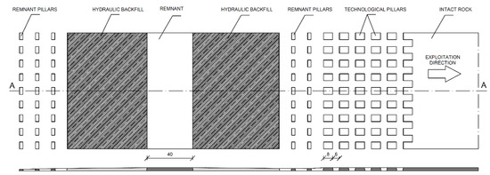 Mining operations in the analyzed field started in March 2005 using a room-and-pillar system with roof deflection. The deposit was cut with rooms and strips into rectangular technological pillars with basic dimensions of 6 × 8 m, which were situated perpendicular to the line of the mining front. The excavations were in the shape of an inverted trapezoid, with the roof width equal to 6 m and the inclination angle of sidewalls 10°. Technological pillars were successively reduced to residual pillars, as the mining front progressed, and left in the mined-out area. In Polish copper mines, the size of technological pillars is selected in such a way that they progressively yield at the stage of separation from the deposit. The width of the working area was generally between 4 and 5 strips (Figure 2) [11].