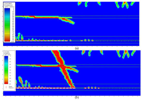 Yielded zones for mining front: (a) approximately 60 m from the remnant edge—36th calculation step, (b) approximately 470 m from the remnant edge—65th calculation step.