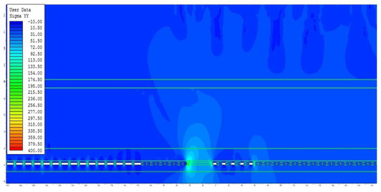 Figure 11, Figure 12, Figure 13 and Figure 14 show the distribution of vertical stresses σy in the analyzed field for the room and pillar system with roof deflection (Figure 11) and with hydraulic backfill (Figure 12 and Figure 13). It can be observed that stress concentration zones occur inside and in the vicinity of the remnant. A comparison between Figure 11 and Figure 12 shows that the violent destruction in the roof above the remnant edge resulted in vertical stress redistributions near the left edge of the remnant and reduced the values of vertical stresses σy in the area of the yielded zone.