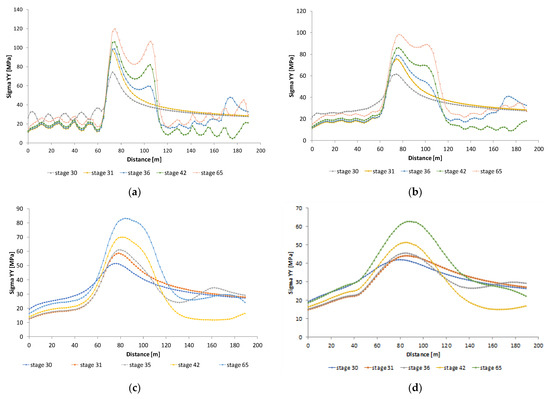 Vertical stress σy in the roof, for vertical distances of: (a)—5 m, (b)—10 m, (c)—20 m and (d)—40 m above the remnant.