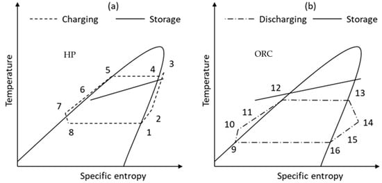 Schematic cycles of the heat pump (a) and ORC (b) in the T, s-diagram including the temperature profile of the sensible thermal storage (solid lines) [24].