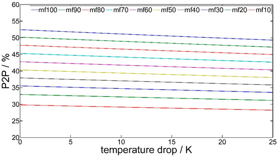 There is no correspondingly large difference when comparing the P2P value for full load operation (52%) with that of the part load case (about 40%) at a considerable temperature drop of 20 K, as well as a mass flow of 50%. This means that at half load, approximately one fifth of the P2P efficiency is lost. These results are in agreement with those of Liu et al. [26], who also practically showed that their application had realistic efficiencies. The results would be similar for other machines, since only properties such as the motor efficiency differ. Overall, a drop in the storage temperature does not cause such large losses of the P2P efficiency compared to reducing the mass flow.