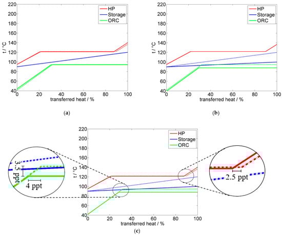 The effects of a temperature drop in the thermal storage of 20 K for R1233zd is displayed in Figure 4b. The temperature difference in the storage is clearly recognizable by the decreased straight gradient of the storage temperature. Since the mass flow in this operating point is 100%, there is no horizontal shift of the pinch point for the HP process as is the case in Figure 4a. In fact, the process remains unchanged in this case.