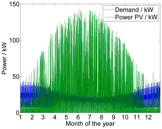 Course of the energy demand and energy supplied by the model PV system, based on irradiation data for Nuremberg, Germany in 2016.