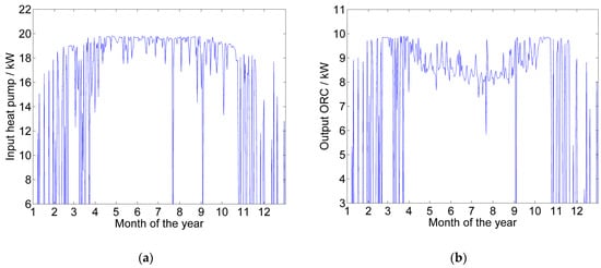 Average heat pump power input (a) and ORC power output (b) for the whole year of 2016.